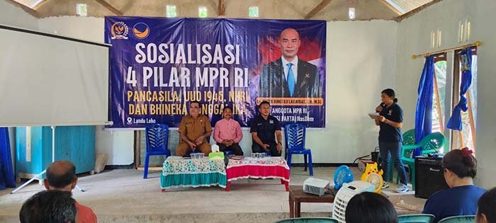 Empat Pilar Kebangsaan yang menjadi materi sosialisasi meliputi Pancasila sebagai dasar negara, Undang-Undang Dasar Tahun 1945 sebagai konstitusi, Negara Kesatuan Republik Indonesia (NKRI) sebagai bentuk negara, serta Bhinneka Tunggal Ika sebagai prinsip kebersamaan. Peserta yang menghadiri antara lain pengurus partai NasDem, tokoh adat yang dikenal dengan sebutan Maneleo, tokoh agama dari berbagai komunitas, pemuda desa, masyarakat umum, simpatisan partai, serta kader muda.