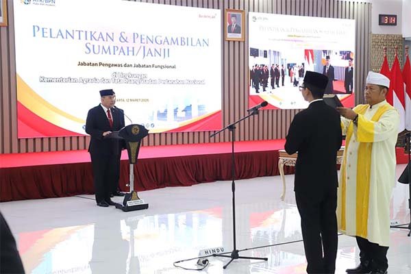 Jakarta,Tintamas.id – Kementerian Agraria dan Tata Ruang/Badan Pertanahan Nasional (ATR/BPN) menggelar Pelantikan dan Pengambilan Sumpah/Janji Jabatan Pengawas dan Jabatan Fungsional, di Aula Prona Kementerian ATR/BPN, Jakarta pada Kamis (12/03/2026). Saat memimpin pelantikan, Wakil Menteri (Wamen) ATR/Wakil Kepala (Waka) BPN, Ossy Dermawan, mengingatkan bahwa para pejabat terlantik merupakan ujung tombak penentu kualitas layanan pertanahan yang akan diberikan kepada masyarakat.